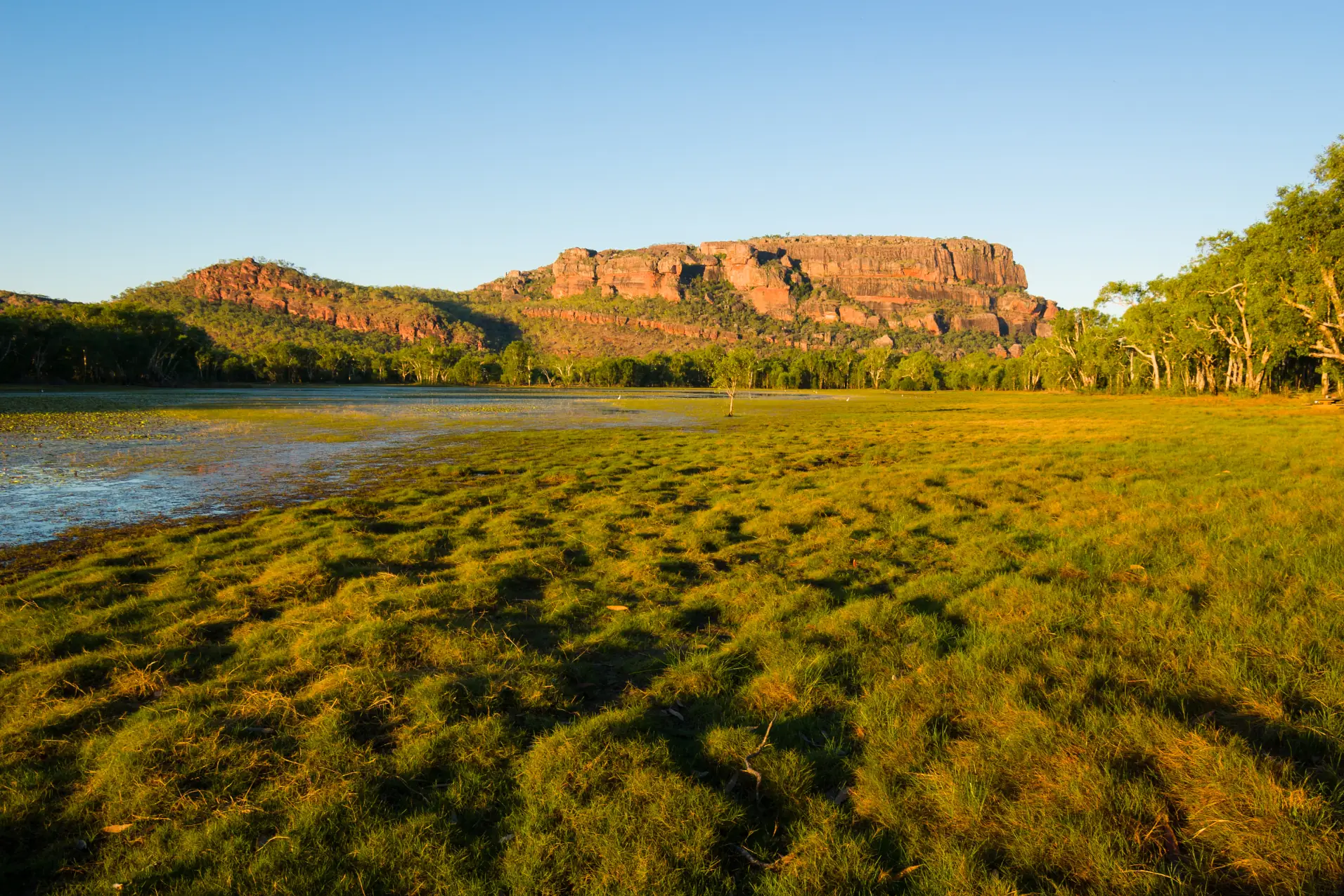Explore the natural beauty of Nitmiluk National Park on a MAKE TRAVEL MATTER® Experience cruise along Nitmiluk Gorge. You’ll wind through this gorge carved through ancient sandstone alongside steep cliff walls, watching for lush rainforest gullies in giant cracks, and maybe a freshwater crocodile or two on the banks. The Jawoyn people have called Nitmiluk (Katherine) Gorge home for a millennia, their deep connection to Country reflected in the ancient tale of the cicada, symbolising their spiritual bond with the land. Journey into Kakadu National Park, where the Yellow Water Billabong cruise unveils untouched wetlands bursting with diverse wildlife and breathtaking scenery. Glide through this tranquil landscape, spotting crocodiles basking in the sun and lush vegetation such as water lilies - a bushtucker food, as you’ll discover from your expert local guide. Keep your eyes peeled for sea eagles, brolgas, and kingfishers, their striking colours adding to the magic of the Top End - an  unforgettable immersion into Australia’s wild beauty.